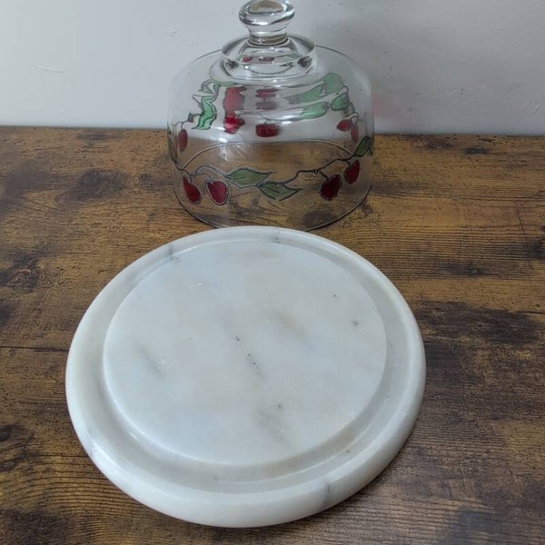 Vintage Glass Marble Hand Painted Cherry Large Cheese Dome 1980s Retro